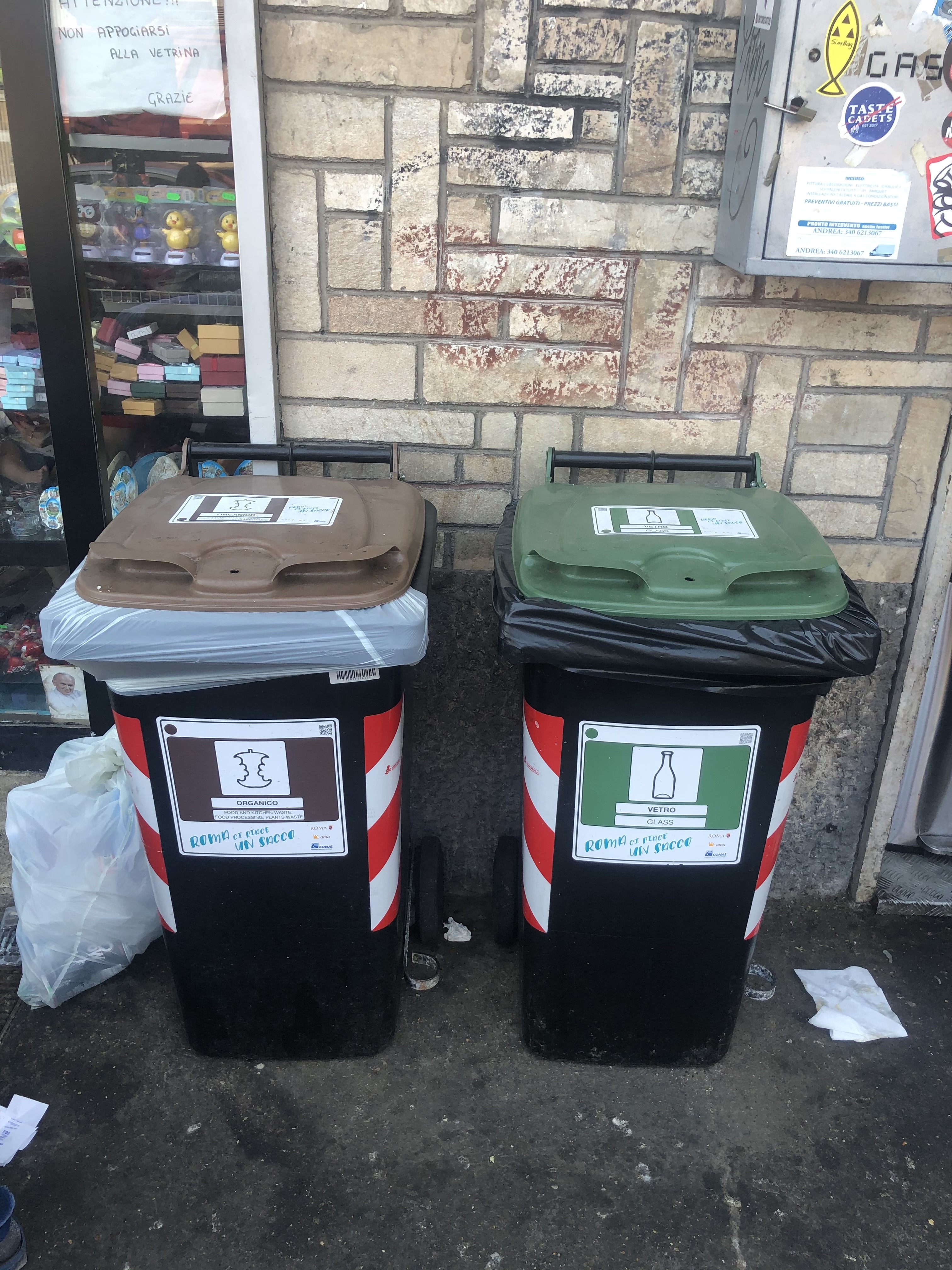 With the exception of UMD, I rarely find collection bins in the U.S. that stray away from the labels of “Trash” and “Recycling”. My campus has been adamant on including compost bins around campus in recent years, but that’s about it. However, Rome was a whole different story. They take trash separation VERY seriously. The apartments my peers and I stayed in during our visit all had multiple trash bins for various materials. Dumpsters lining public streets and alleys had explicit instructions on what items belonged. Even various food establishments were equipped with multiple bins for different kinds of waste! Pizzarium (a pizza joint about 3 min walking distance from my place) was the best example I saw of this, as they had 5 different bins! To say I was impressed is an understatement.